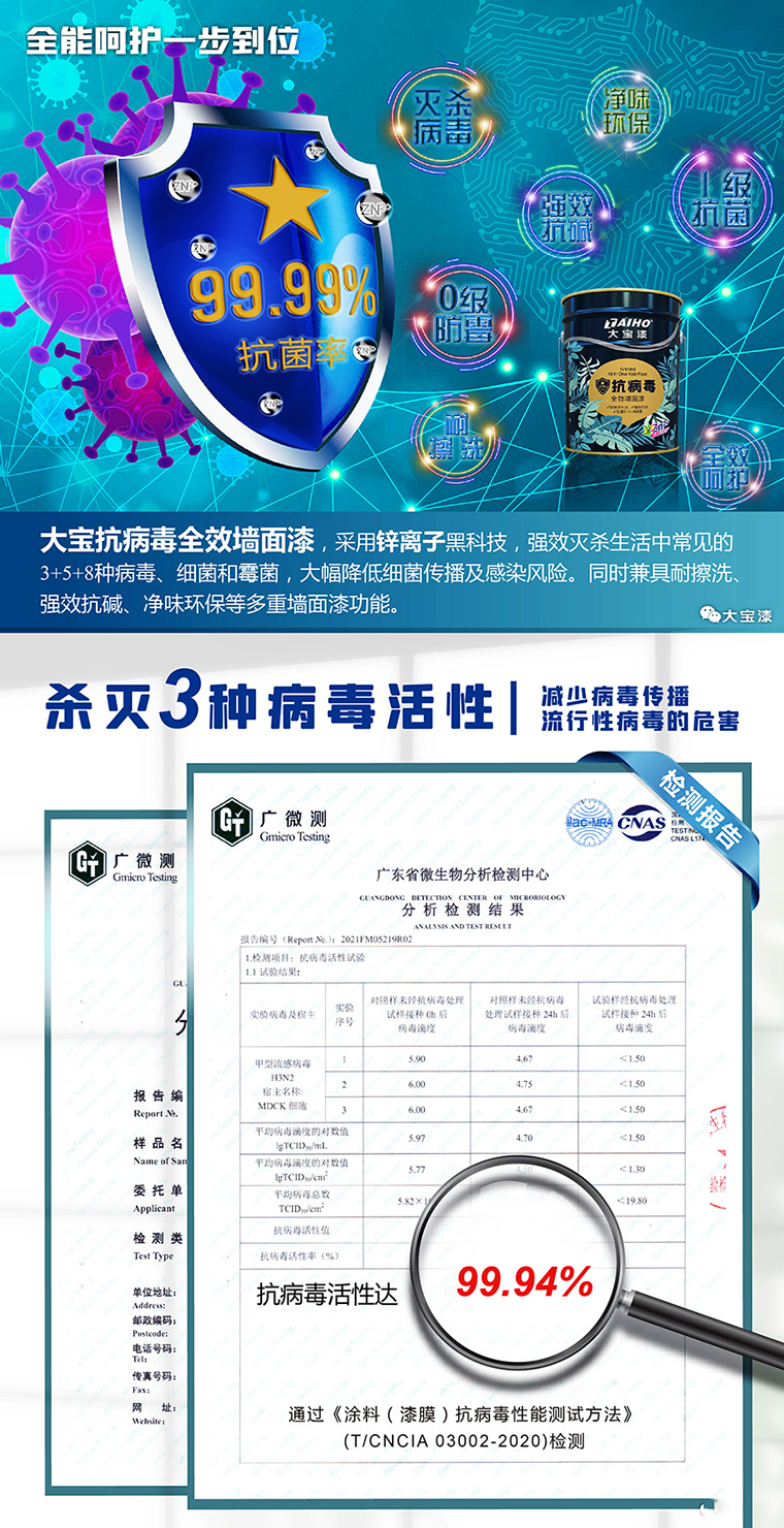 因應(yīng)日趨嚴(yán)峻的疫情,大寶抗病毒全效墻面漆的誕生猶如一場及時雨,給予我們實質(zhì)上的安全感,全方位締造健康安全的居室空間。