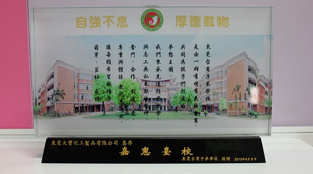 作為東莞臺商協會重要成員、東莞臺商子弟學校建校董事之一的大寶國際董事長陳賀生先生時刻關心學校的發展狀況,并以實際行動支持學校的發展壯大,學校曾獲“臺商辦學典范”等殊榮。如今學校占地面積達13.7萬多平米,設有幼稚園、國小部、初中部及高中部,現有學生2500多人。