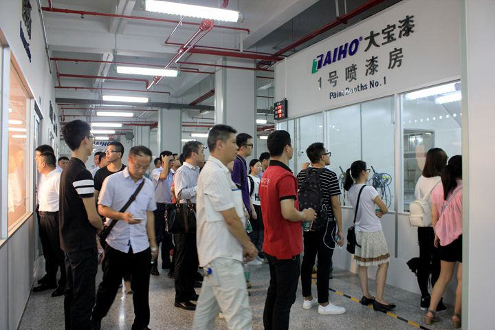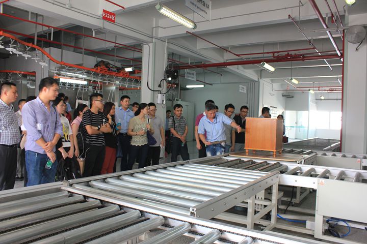 會后,在大寶化工平義聰課長的全程陪同下,索菲亞參訪人員一行先后到東莞大寶化工色板中心、中央實驗室、后花園、污水處理中心、智能涂裝測試線等進行參觀。技術人員為到訪人員講解廠區各區域規劃性能,在參觀色板中心時,索菲亞同仁們對大寶漆色板表現出極大的興趣,不斷與大寶漆工作人員交流探討心中疑問。