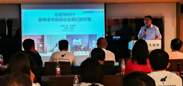 隨后由業三部東北區域業務課長黃河玉向經銷商系統而專業地介紹了近期公司上市的各渠道新產品。從零售渠道新推出的大寶抗病毒全效墻面漆、零純+植物抗菌墻面漆,到專業領域的絲絨蛋殼光產品、陽臺廚衛專用漆、工業風裝修所需的炫黑涂料;從工程渠道的仿石漆產品、地坪漆到工程領域新關注的無機涂料產品系列、大健康產品系列再到工業領域的輕防腐系列產品;從家裝市場輔助材料的防水、墻地固、瓷磚背膠系列到工程翻新和維修渠道的滲透型界面劑、大寶液體卷材等,黃課長結合每種產品的上市背景、物性介紹、產品認證和檢驗報告等內容向經銷商推介每種產品的市場推廣方向、市場銷售機會及施工注意事項。