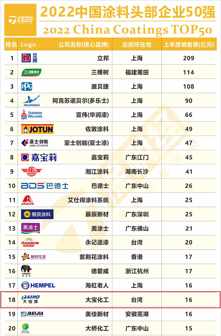 “2022中國民族涂料50強”榜單排名依據上一年度銷售額, “民族涂料”,是指發源地為中國(包括港澳臺)、不涉及外資(港澳臺資本除外)的涂料企業,且只選取其上一年在中國市場(包括港澳臺)的銷售數據作為排行依據。