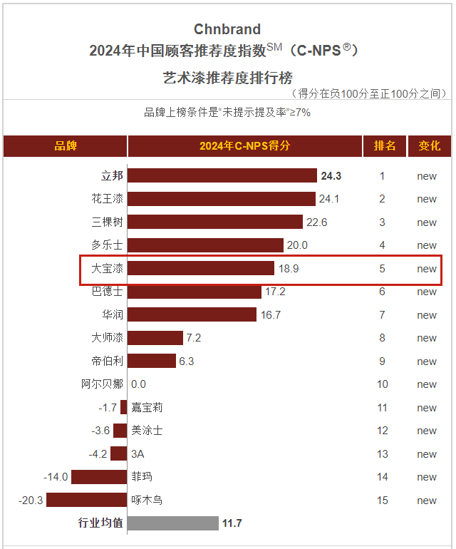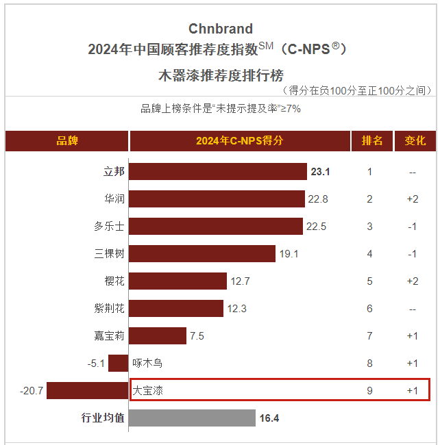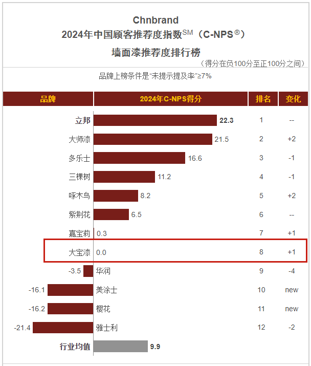 1月,品牌評級權威機構Chnbrand發布2024年(第十屆)中國顧客推薦度指數(C-NPS)品牌排名和分析報告。大寶墻面漆、木器漆、藝術漆分別以優異的口碑入圍排行榜單。