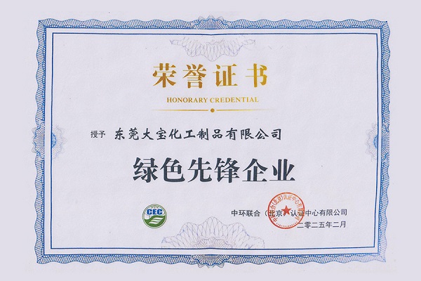 2025年3月20日,在廣東珠海舉行的中環(huán)聯(lián)合認證中心重點客戶交流會上,東莞大寶化工制品有限公司憑借在綠色低碳領(lǐng)域的卓越表現(xiàn),榮獲“綠色先鋒企業(yè)”稱號,彰顯了其在可持續(xù)發(fā)展方面的領(lǐng)先實力。