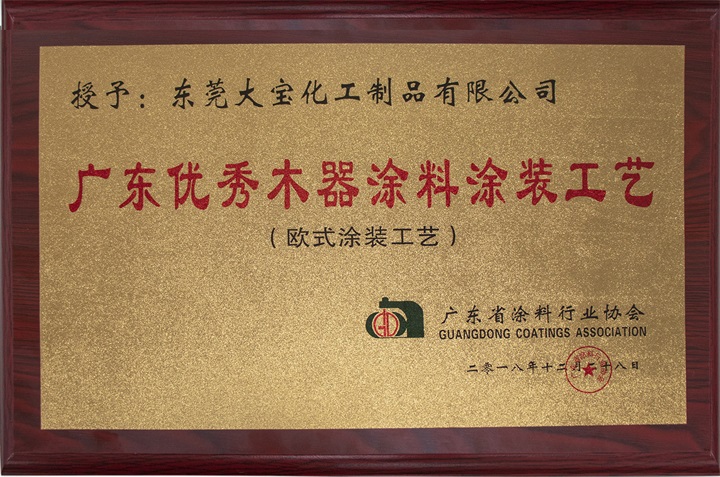 在2018廣東環保涂裝發展大會上,舉行了廣東省涂料行業協會“涂裝分會”成立儀式、2018廣東優秀涂料涂裝項目表彰活動。憑借在綠色涂裝領域的優勢和良好口碑,大寶漆被授予廣東省涂料行業協會涂裝分會“副理事長單位”。 在大會頒獎環節,大寶漆歐式涂裝工藝還獲得“廣東省優秀木器涂料涂裝工藝”榮譽。