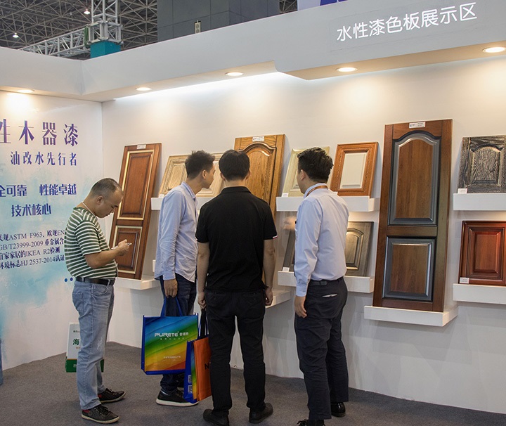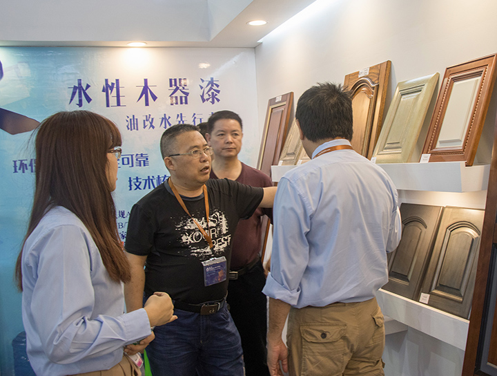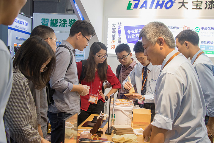 針對(duì)整個(gè)行業(yè)的環(huán)保轉(zhuǎn)型需求,大寶漆一直致力于推動(dòng)環(huán)保涂裝。其中,大寶漆展示的水性著色劑具著色與防脹筋效果、簡(jiǎn)化流程,無(wú)需使用素材處理劑、涂膜通透性優(yōu)異等,可極大的滿足家具廠復(fù)古簡(jiǎn)約產(chǎn)品的涂裝需求。該產(chǎn)品的涂膜厚度達(dá)到納米級(jí)別,可與國(guó)際頂尖化工集團(tuán)PPG、阿克蘇諾貝爾等的產(chǎn)品比美。在展會(huì)上該產(chǎn)品一度成為觀展商關(guān)注咨詢的焦點(diǎn)。