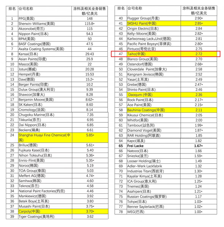 全球頂級涂料企業排行榜公布,大寶漆位居第47名