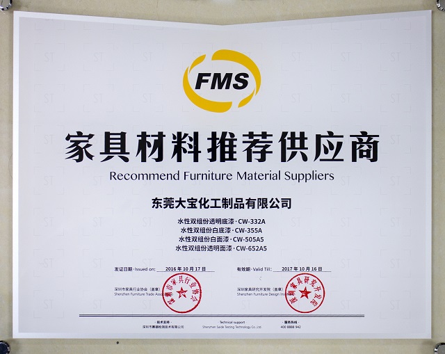 因為始終對品質及服務的堅持,大寶漆已先后斬獲業界多項殊榮,并通過中國環境標志產品、國家實驗室等權威認證。此次又獲“推薦供應商”的榮譽,是行業對大寶漆的認可和鼓舞。作為一個優秀的家具原材料供應商,大寶漆將繼續堅持品質創新,恒守“永續環?!钡某兄Z。未來,大寶漆會繼續專注于高品質涂料的研發,給消費者提供更多品質優越、健康環保的涂料產品。