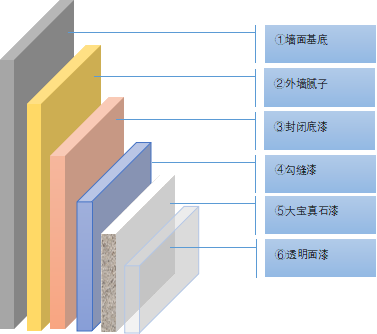 真石漆是以高品質純丙烯酸合成乳液為主要粘結劑, 以天然彩砂為骨料及選用各種優質助劑配制而成,具有耐水性、耐堿性好,粘接強度高,涂層堅硬,耐候性優等特性。晶瑩剔透的漆面突出強烈的藝術效果 ,是一種高級、自然、莊重、樸實具有天然風格的豪華型裝飾涂料。
