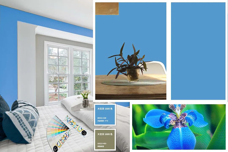 明艷的鳶尾如藍色蝴蝶在深綠色的葉片中起舞,像是畫家筆下一幅濃郁的油彩畫,在顏色的涂抹間盡顯鳶尾的高貴。